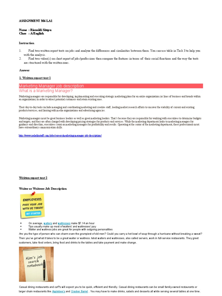 Assignment M6 La1 Pdf Waiting Staff Gastronomy
